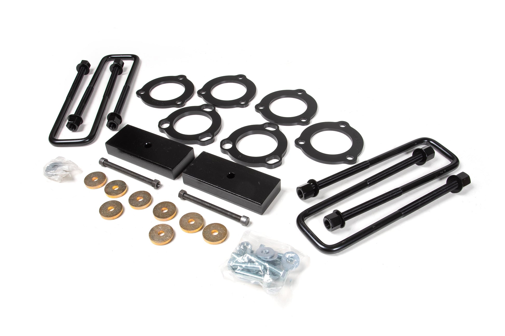 - Rear lift blocks and u-bolts to lift and level the stance, sway bar correction, brake line and bump stop relocation brackets to correct operating angles.